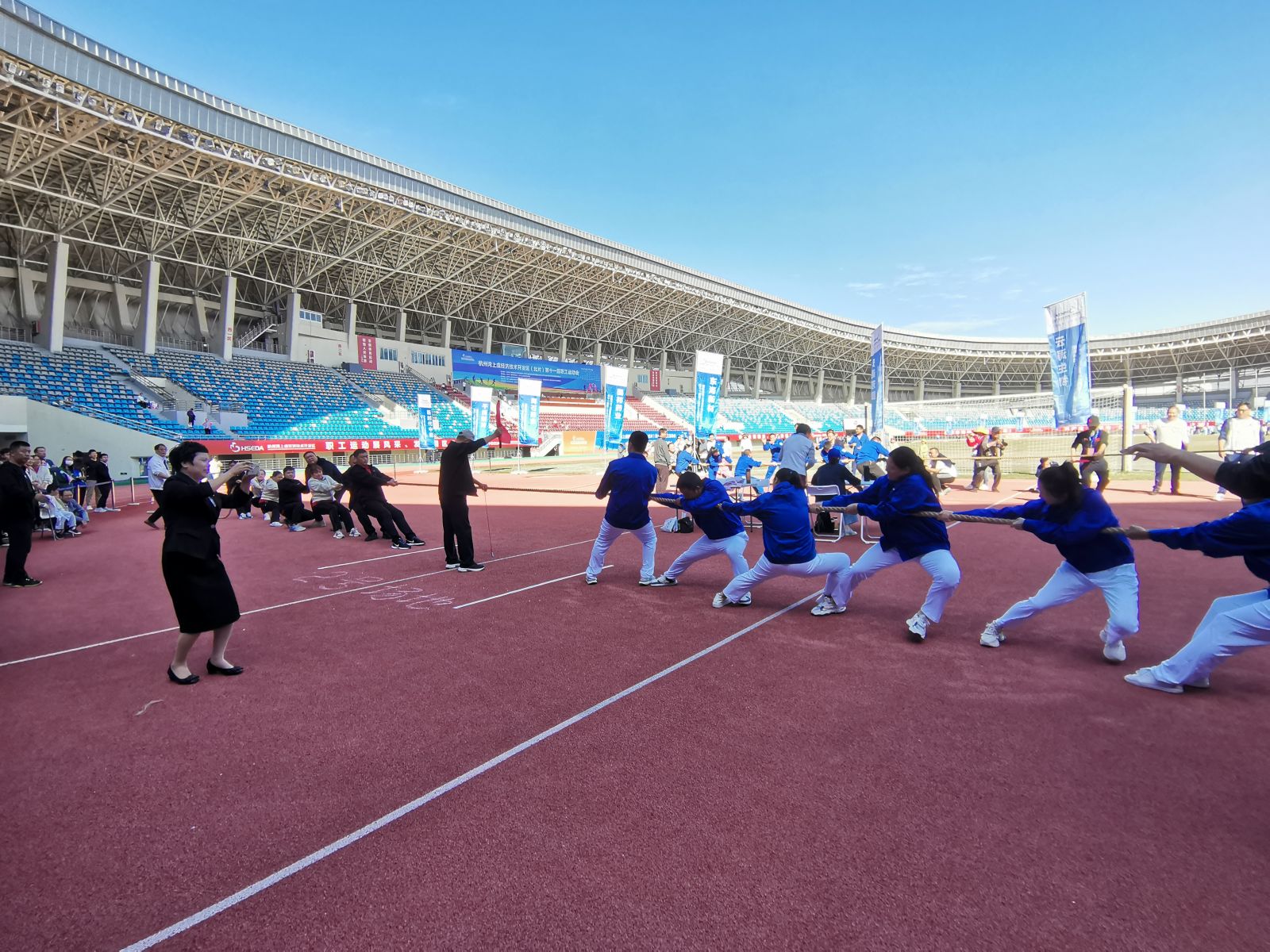 拔河比赛中,m88官网的运动健儿全力以赴,凝神聚气,拉开“弓”字步,倾斜着身体咬紧牙关,拼尽全力将绳索往自己的方向拉拽,在拉锯战中挑战自己的体力和意志力的极限,最终取得团体赛第一的优异成绩。