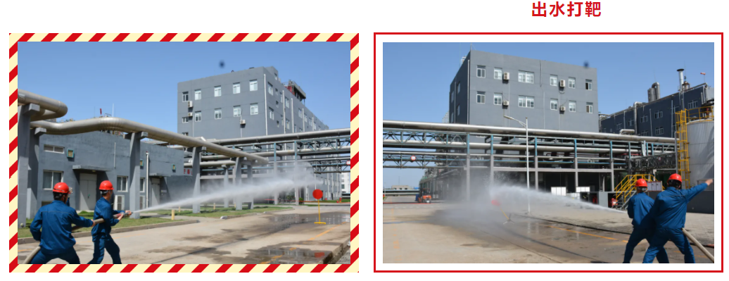 出水打靶中运动员三人一组,需要完成铺设、连接水带,开阀门,出水打靶等一系列动作,用时短者获胜。这一项目需要三人通力合作、协调配合,任何一个环节出现错误则无法完成比赛,可以很好的锻炼员工的专业技能和团队合作能力。